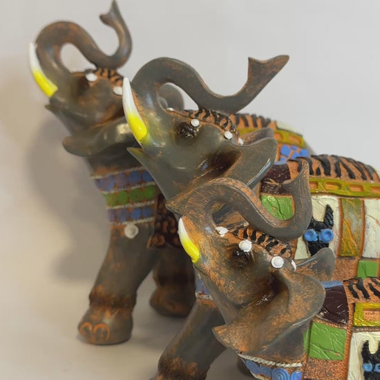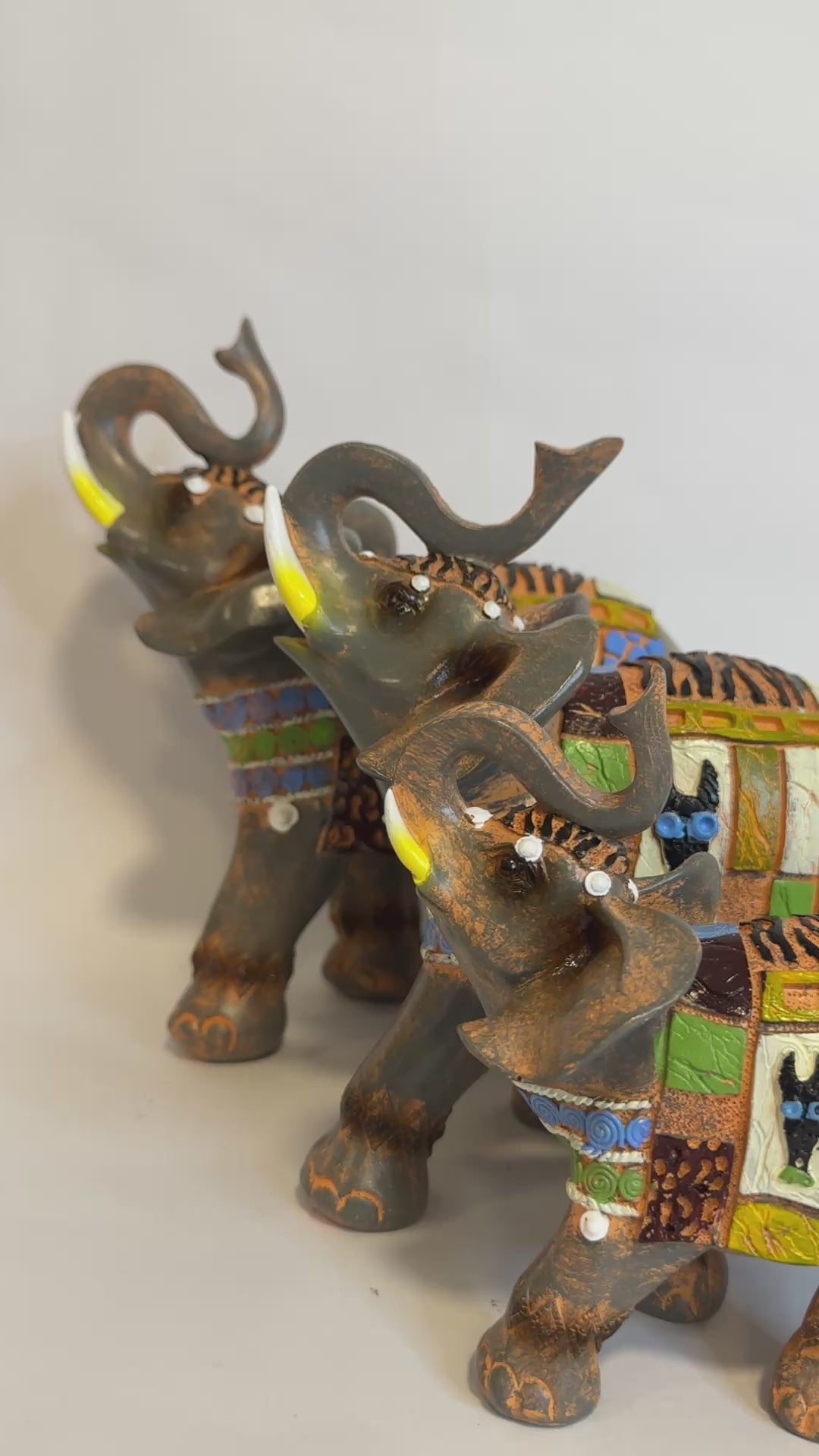 Prosperidad y Buena Suerte: Se cree que los elefantes, especialmente con la trompa hacia arriba, atraen la fortuna y la prosperidad al hogar. El número tres es un número de poder en diversas tradiciones, lo que potencia el efecto de las figuras.