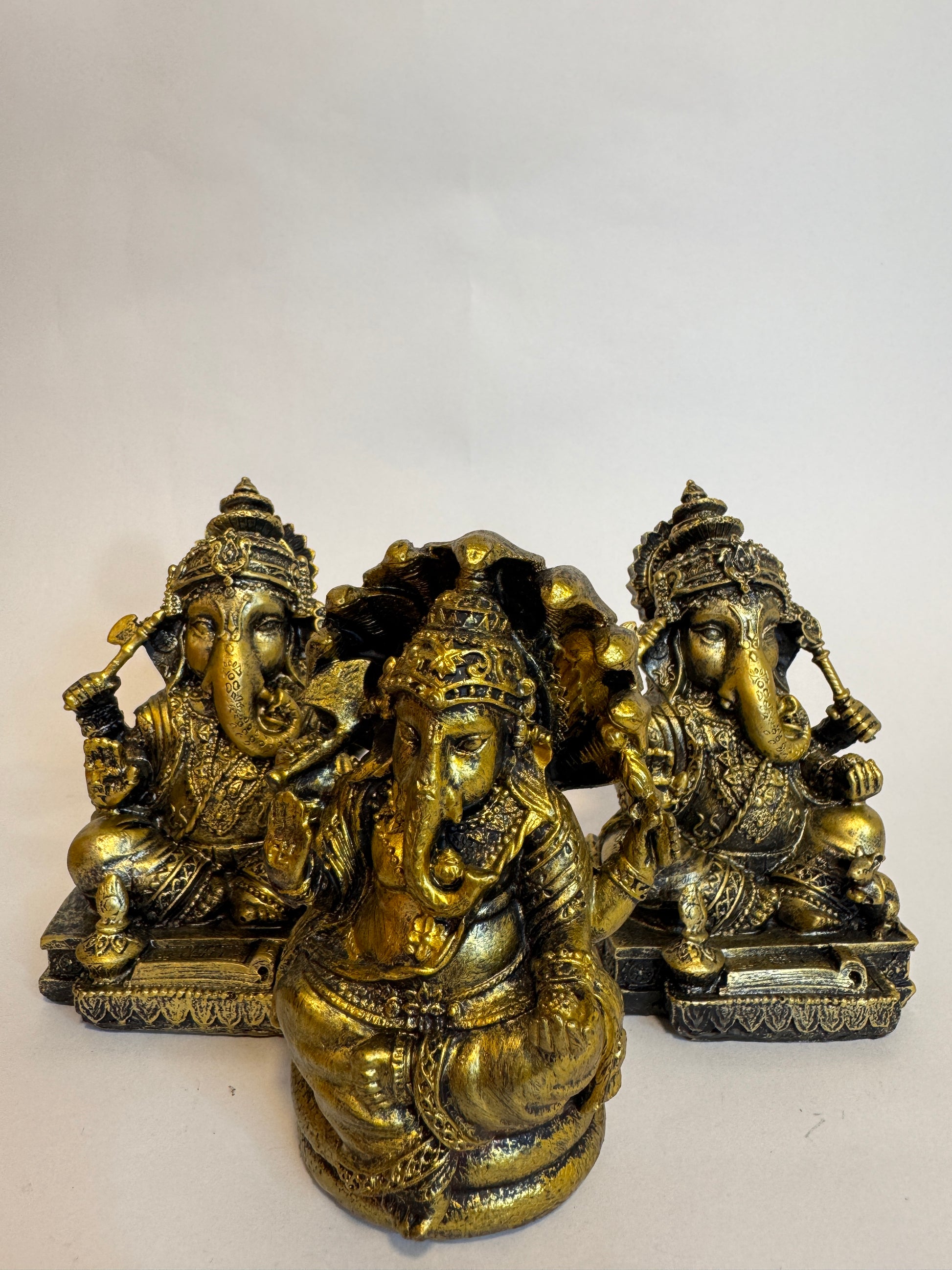 Se puede apreciar su cabeza de elefante y su figura humana en una pose sentada, conocida como Lalitasana, que proyecta una sensación de serenidad y benevolencia.