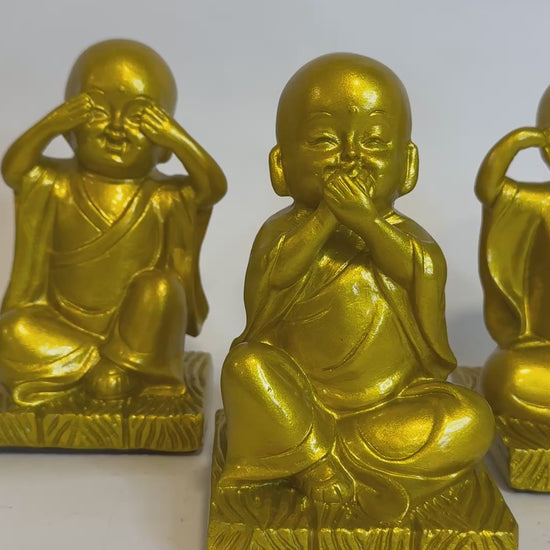 Kit de los 3 Budas Sabios Dorados Figuras en tono dorado que simbolizan protección, sabiduría y prosperidad: “no ver el mal, no oír el mal y no hablar el mal”. Ideales para atraer armonía y buena fortuna