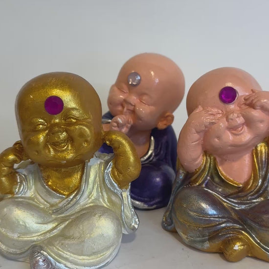 Este tradicional set representa a los Tres Budas Sabios, conocidos por su enseñanza ancestral: “no ver el mal, no oír el mal y no hablar el mal”. Cada figura encarna un recordatorio espiritual sobre la importancia de cultivar pensamientos, palabras y acciones en armonía con la bondad.