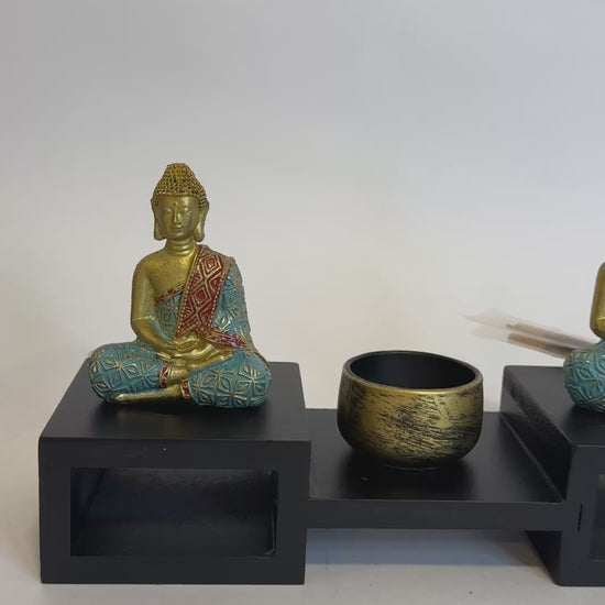 La luz de las velas, acompañada por la presencia de los Budas, proyecta un ambiente cargado de energía positiva, calma y prosperidad. Es ideal para momentos de meditación, relajación o como decoración significativa en el hogar, oficina o espacio sagrado.